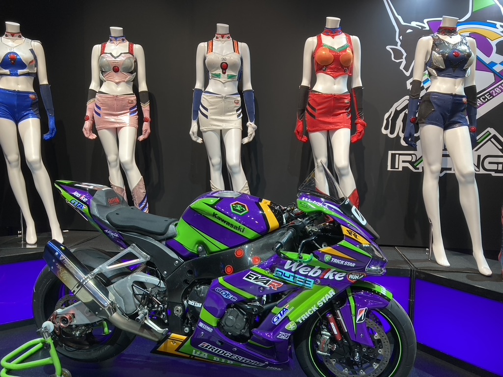 説明されなくても色だけで初号機モチーフだとわかるバイクと、布面積がどれだけ少なかろうとプラグスーツのオマージュだとわかるコスチューム。もう「それっぽい色」だけでエヴァだとわかるほど、作品の印象は僕らの脳裏に刻まれてしまっている。